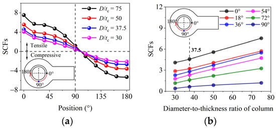 Effect of the diameter-to-thickness ratio of the column on SCFs. (a) SCF distribution along the weld. (b) SCF at different points.