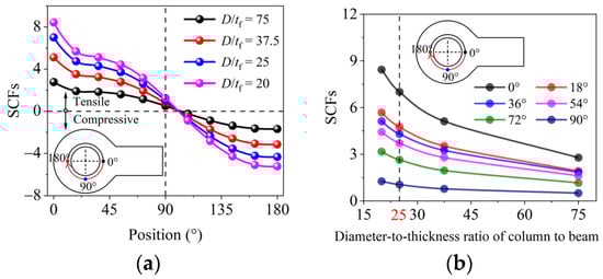 Effect of the diameter-to-thickness ratio of column to beam on SCFs. (a) SCF distribution along the weld. (b) SCF at different points.