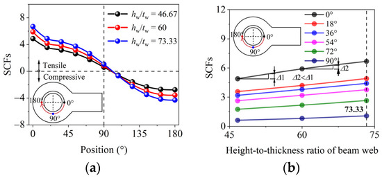 Effect of the height-to-thickness ratio of beam web on SCFs. (a) SCF distribution along the weld. (b) SCF at different points.