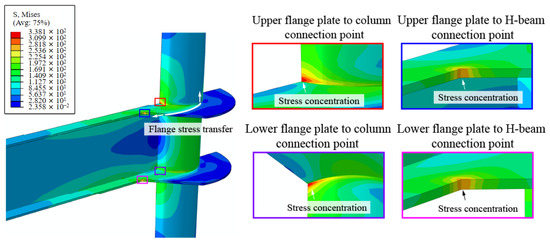(4) The installation of a circular stiffener at the center of STCSB connections or the addition of stiffeners on the outer sides of the column’s upper and lower outer flanges effectively alleviated stress concentration. This optimization enhanced the connection’s bending resistance, highlighting the significance of flange plate design in the optimization of fatigue performance.