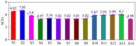 The maximum SCFs for specimens S1–S14 are illustrated in Figure 19. Specimens S1–S6 incorporated stiffeners on the outer sides of the upper and lower outer ring plates of the column; S7–S8 featured circular stiffeners at the connection’s central position; S9 utilized the diamond-shaped ring plate, which is the standard STCSB connection; S10–S12 utilized arc-shaped ring plates; and S13–S14 employed circular ring plates. The computational results indicate that the addition of stiffeners at various locations and forms led to a fluctuating distribution of the maximum SCFs. Notably, specimen S4 exhibited the lowest maximum SCF, at 4.97, whereas specimen S2 recorded the highest SCF, reaching up to 7.05. This can be attributed to the stiffeners facilitating stress transfer at the connection between the ring plate and the column, significantly reducing the stress concentration effect at this location and causing a shift in the position of maximum stress concentration at the connection. Furthermore, the diamond and circular outer ring plates demonstrated better improvements in the maximum stress concentration effect. Collectively, these findings suggest that the addition of stiffeners can effectively mitigate stress concentration effects in the connection area and enhance the flexural performance of the STCSB connection.