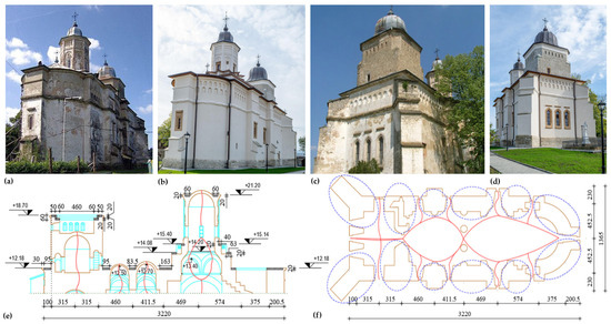 The Church of Saint George, Bârnova Monastery: (a,c) before conservation, (b,d) after conservation, (e) crack pattern—transverse section, (f) crack pattern—longitudinal section.