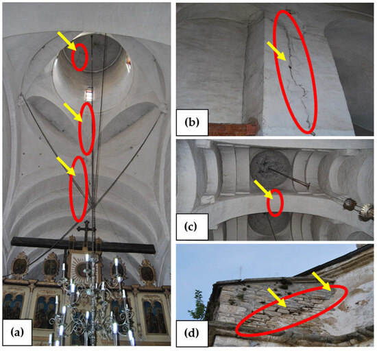 Visual inspection: (a) continuous longitudinal fracture, originating from the porch and extending to the altar, (b) displacements identified between the chimney and the arch in the wall, (c) cracks in the masonry above the entrance extending into the narthex vault, and (d) fractures of the buttresses at the point of contact with the exterior walls.