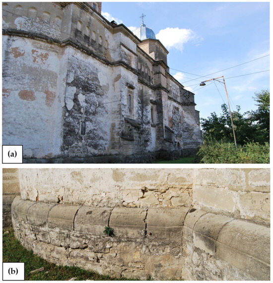 In the case of the Church of Saint George, it was observed that the uncontrolled presence of water poses a significant threat to the preservation of heritage assets, a concern that has persisted throughout architectural history [39,40]. Specifically, water infiltration from the ground via capillary action, facilitated by the porous nature of the stones and mortar, was noted (see Figure 3). This phenomenon, commonly referred to as rising damp, is widely recognized as detrimental to porous materials, as it can exacerbate frost-induced damage and render them susceptible to additional degradation mechanisms, including biological growth and wind erosion [41,42]. Through visual inspection, it is obvious that the church was profoundly affected by rising damp, manifesting in at least two common degradation patterns on the external walls: discoloration (darkening) (see Figure 3a) and efflorescence (see Figure 3b).