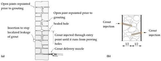 Cracks and voids grouting: (a) technology; (b) grouting depth compared to the width of the walls.