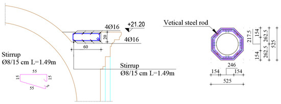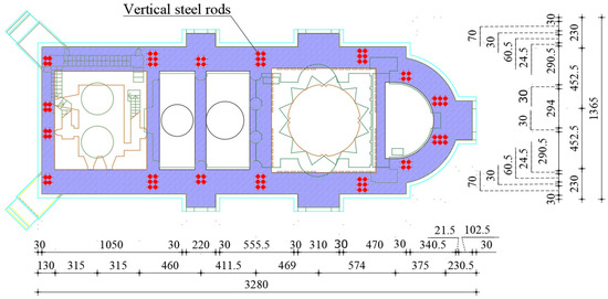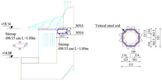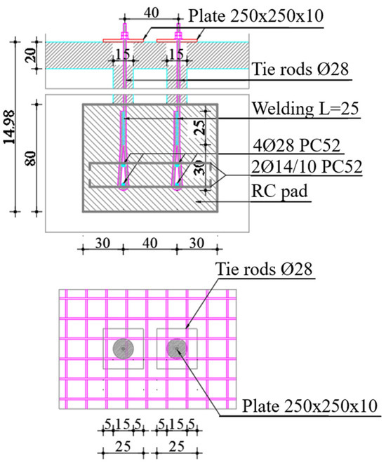 For the installation of the vertical tie rods, it was necessary in the first stage to construct anchoring pads for the tie rods within the stone masonry at the foundation of the church (Figure 5). These pads intersected with the channels prepared for the vertical tie rods in the area of their anchoring. Concrete was poured into the prepared channels to ensure a continuous connection around each zone (narthex, nave, altar), with care taken to achieve a continuous bond. Additionally, to maintain continuity, concrete pouring was conducted continuously in each region.