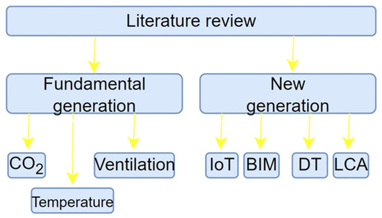 In the literature review, we distinguished two types of scientific papers for the analyzed topic—fundamental and new-generation articles (Figure 3). The term “new-generation articles” has come about as technology has advanced, particularly with the influence of the era of Industry 4.0. In contrast to the fundamental research focusing on basics such as CO2, ventilation, heating, and IAQ, the new-generation articles highlight current trends such as IoT, digital twins (DTs), LCAs, BIM, and more. This categorization highlights the shift in research focus and emerging trends in the study of school buildings.