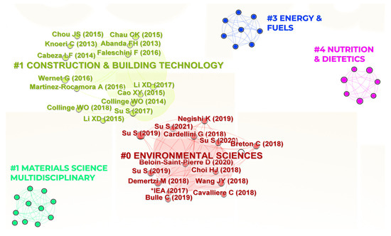 The examination of the provided data revealed significant patterns in categories such as citation counts, bursts, degrees, centralities, and sigma values across various clusters. In clusters #0 and #2, as shown in Figure 4, the most cited author was Su et al. (2019) [85], Li et al. (2017) [86], Su et al. (2020) [87], and Su et al. (2021) [88], accumulating a total count of 16 citations. The citation for Su emphasized their considerable influence in environmental, construction, and building technology sciences. Notably, Su was consistently mentioned in each visualization category, indicating that Su held the utmost relevance in the field of LCA research.