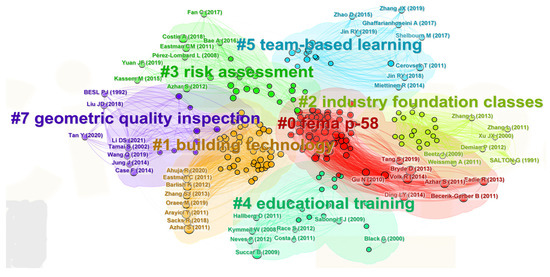 Figure 5 illustrates the main clusters identified through the BIM visualization. The complex network consists of a total of 11 clusters, each representing a different aspect of BIM application and research. In order to focus on the most significant contributors, the subsequent analysis zeroes in on the seven largest clusters, identified as #0 (FEMA p-58), #1 (building technology), #2 (industry foundation classes), #3 (risk assessments), #4 (educational training), #5 (team-based learning), and #6 (geometric quality inspections). These clusters cover various dimensions of BIM, ranging from its applications in risk assessments and building technology to educational training and team-based learning.
