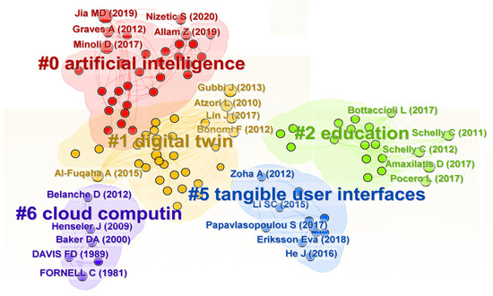 Figure 6 shows the main clusters of the IoT visualization, revealing the complex connections within the network. There were a total of 10 clusters in the network, each making a unique contribution to the extensive field of IoT-related research. These clusters covered various research areas, including artificial intelligence (#0), digital twins (#1), education (#2), big data analyses (#3), cloud computing (#4), tangible user interfaces (#5), digital libraries (#6), and educational materials (#7).