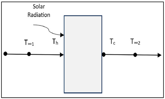 where qh,convection is the convection heat transfer rate per unit area (W/m2) from the heat source to the hot surface of the block, qconduction is the conduction heat transfer rate per unit area (W/m2) through the solid block and qc,convection is the convection heat transfer rate per unit area (W/m2) from the cold surface of the block to the cold air. It can be written in terms of temperatures of Figure 1 as shown in Equation (2):