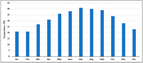 Due to the geographical location of Bahrain, it experiences a hot climate for most of the months of the year, i.e., from April to November. The average temperatures in Bahrain from the years 2015 to 2024 [36] are presented in Figure 2. The average annual maximum temperature is 41 °C in the month of July, and the average annual minimum temperature is 21 °C in the months of January and February. Also, to note that the average annual relative humidity in the past 10 years ranges between 53% and 63% [37]. Because of this reason, the effective heat felt is much higher than the actual temperature. These reasons contribute to the fact that residents rely heavily on air-conditioners to obtain comfortable indoor temperatures. It was estimated that 6.34 TWh of electrical energy was used for cooling during May to October 2016, most of which was utilized during the June–September months, and these results were translated into a total electricity cost of 507.443 million USD [38].