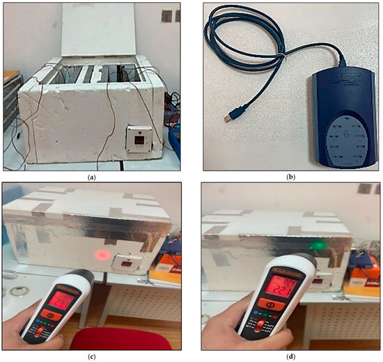 Improvements in the hotbox setup for present work. (a) The outer surface of the hot box is insulated using polystyrene to reduce the heat losses. (b) A Pico Log TC-08 data logger, with specifications [39] was used for temperature measurement and recording. (c) The top surface of the hot box is well sealed with aluminum tape. A heat leak detector is used to check the heat losses. Red light shows that leakage of heat exists. (d) The hot box is further sealed from the top and sides with aluminum foil up-to the point when green light appeared.