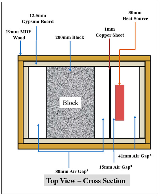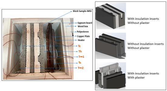 For current work, Figure 6 shows the dimensions of the hot-box experimental setup, while the internal view of the hot box and the three conditions of the IMSI block under consideration are presented in Figure 7.