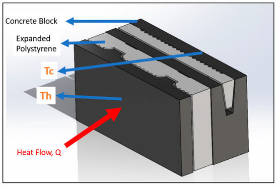 where T∞1 (°C) is the temperature of the hot air developed by the heat source; Th (°C) is the hot surface temperature of the block facing the heat source and hot air; Tc (°C) is the cold surface temperature of the block; and T∞2 (°C) is the cold air temperature. While, Rhot-air (m2·°C/W) and Rblock-exp (m2·°C/W) is the thermal resistance of hot air and Rcold-air (m2·°C/W) is the thermal resistance of cold air for the block. The thermal resistances of each layer are defined as in Equation (3):