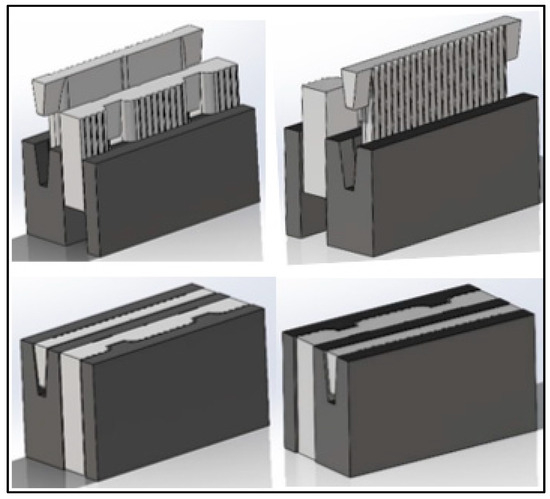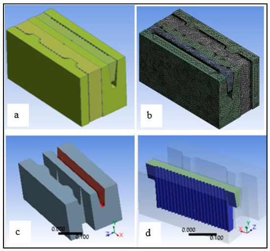Figure 10a shows the 3D design that was imported in Ansys. Figure 10b shows the meshing that was applied on the IMSI block, where the minimum proximity size of the meshing was set to be 0.003 m, while its maximum size is 0.02 m with a growth rate of 1.80 and the total number of elements in the assembly are 1.75 million. Figure 10c,d highlights the contact’s command, wherein the ‘Bonded’ command has been used for the block’s cavity as the contact and the insulation material as the target body. This command allows the software to treat those bodies as one body that is bonded with no friction or sliding between the parts.