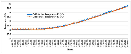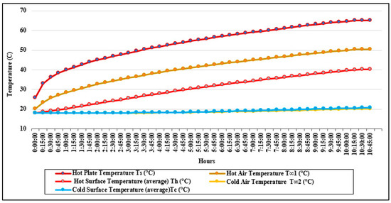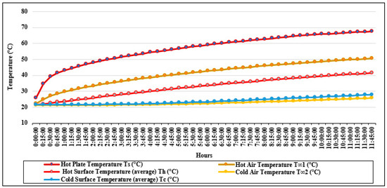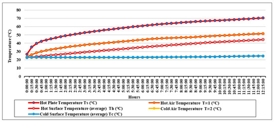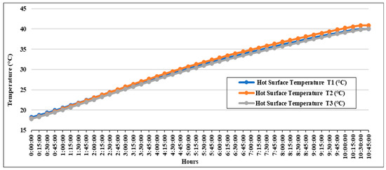 Once the electric current and heater were switched on, the heat gradually flowed thereby orderly increasing the temperature of the hot copper plate, hot air, hot surface of the block, cold surface of the block, and cold air. Three thermocouples were placed on the hot surface and two on the cold surface of the block. The temperature distribution with respect to the time for the steady state to be achieved is presented in Figure 11 and Figure 12, respectively. Through these graphs, an appropriate distribution is presented that shows normal behavior of the rate of heat transfer.