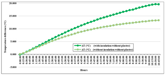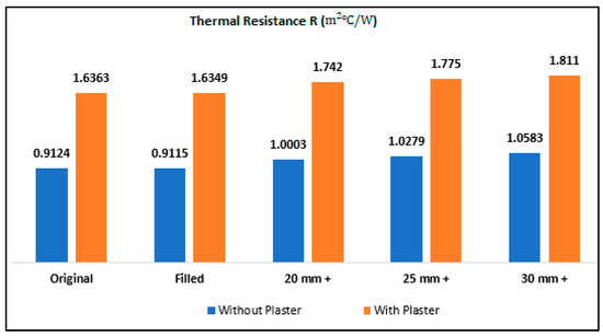 Also, as seen in the figure, a gradual increase in the thermal resistance with respect to the increase in the height of the rear insulation was observed. The values of the thermal resistance of the original block without plaster and with plaster were 0.9124 m2·°C/W and 1.6363 m2·°C/W, respectively, which increased to 1.0583 m2·°C/W and 1.8110 m2·°C/W, respectively, at its maximum optimized condition of +30 mm.