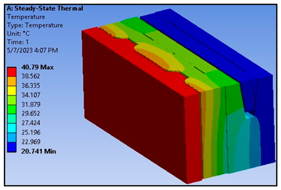After conducting the simulation, it was noted that the value of hot temperature (Numerical) was 40.79 °C. While the value of hot temperature from experimental method (Experimental) was 40.318 °C. Eventually, the deviation between these values turned out to be 1.171%.