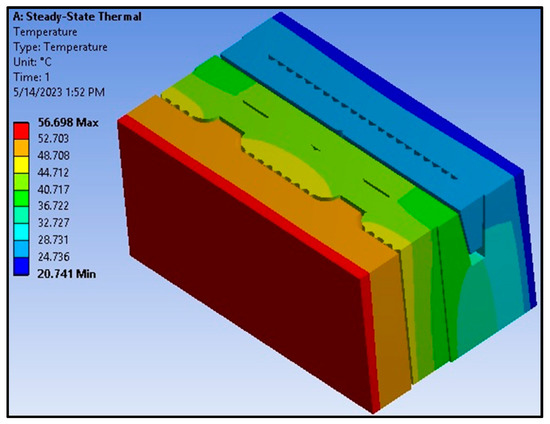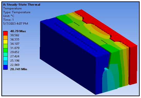 An external plaster of 25 mm on the inner and outer surface of the IMSI block is applied in accordance with the guidelines provided by the Electricity and Water Authority (EWA) of Bahrain. The input parameters for this numerical investigation are the same as the previously mentioned values (the cold side was set as 20.741 °C, and the heat flux set on the hot side of the blocks was 21.974 W/m2). However, the thermal conductivity of the external plaster in this simulation will be considered, which is 0.08 W/m K [33]. The sides of the IMSI block with plaster are perfectly insulated with the “bonded” contacts command being applied between its parts and between the plastering, as well, to identify it as one body with no gap, sliding, or friction in between. Further, the effect of applying the plaster on the thermal resistance of the block was analyzed.
