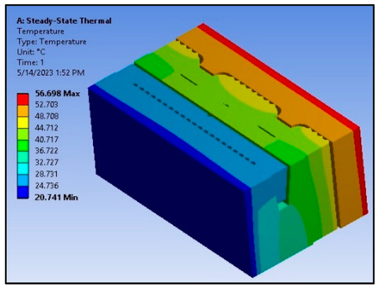 The thermal resistance of the IMSI block in the experimental setup was investigated by conducting a numerical analysis using Ansys simulation software R15.0 (2021-22). The design of the block was prepared using the design software SolidWorks (2021-22), as shown in Figure 8 and Figure 9. Detailed designs are available in Appendix A Figure A1, Figure A2 and Figure A3. Figure 8 is the setup for the numerical investigation of the IMSI block, wherein the input values correspond to the ones from the experimental method to furthermore check for its validity. Three different variables are considered, which include the hot temperature (Th) in °C, cold temperature (Tc) in °C, and heat flux (Q) from the direction of the heat flow in W/m2.