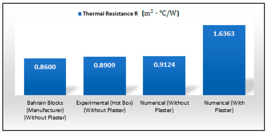 Figure 21 shows an important part and comparative study of the overall research work. Starting with the manufacturer’s value from Bahrain blocks without plaster, this value is referenced from the manufacturer as 0.86 m2·°C/W, while the experimental value using hot box was 0.8909 m2·°C/W, thereby showing a deviation of 3.59%.