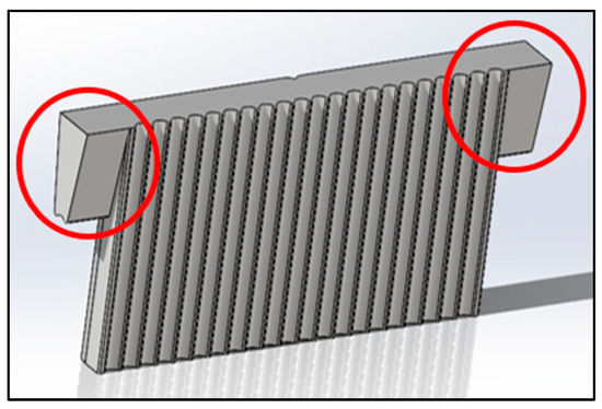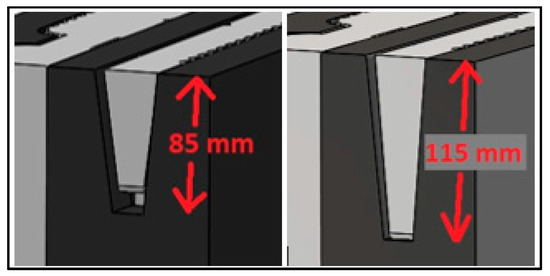 Figure 22 shows the geometry of the rear insulation that was optimized where the height of both ends of the rear insulation was gradually increased. This was to investigate the effect of the change in the insulation’s height on the thermal resistance of the IMSI block. Figure 23 shows the original condition of the block, where it has 85 mm of depth into the cavity with a gap for air and the maximum optimization of 30 mm increment in its height, resulting in a total height of 115 mm with no gap for air. Hence, removing concrete material from the cavity and replacing it with expanded polystyrene.
