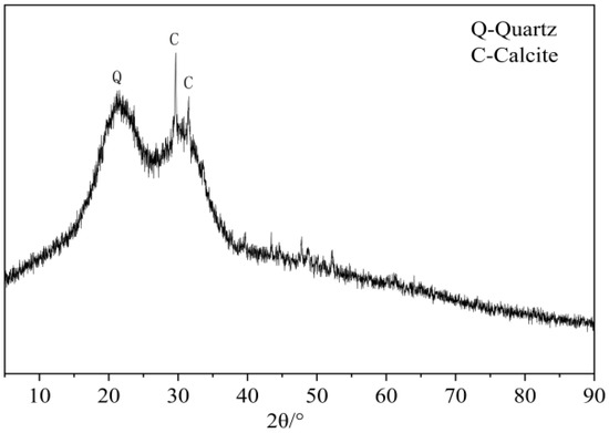 The slag used in this study is S95 grade granulated blast furnace slag. The basic parameters are detailed in Table 1, while the results from the XRF chemical composition analysis are presented in Table 2. Additionally, the results of the XRD analysis of the slag are depicted in Figure 1. The results reveal that the predominant component of the slag is glassy, with quartz and calcite being the primary crystalline phases identified. This composition suggests specific behaviors in the slag’s reactivity and its potential effectiveness in alkali-activated formulations.