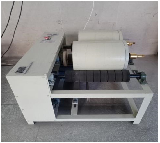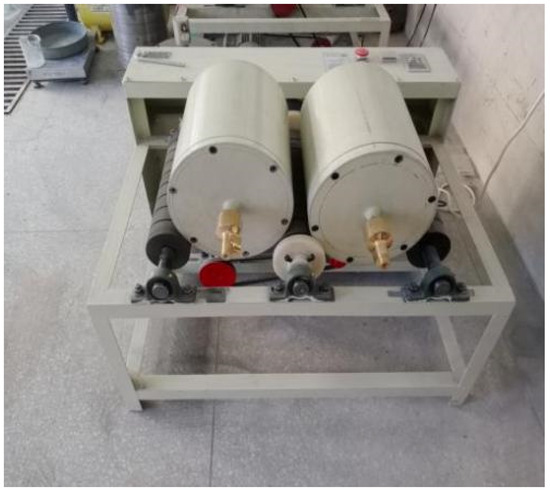 The alkali-activated cement was prepared using a mechanochemical approach, involving the mixing and milling of slag with an alkali activator. This process utilized a WZM-15 × 2 ball mill machine (in Figure 2 and Figure 3), which features a 15 L capacity and double-barrel configuration, with an inner diameter of 26 cm for the ball milling jar. The ball mill uses steel balls of 10, 20, and 30 mm diameters, totaling 15 kg, in a mass ratio of 1:1:1.