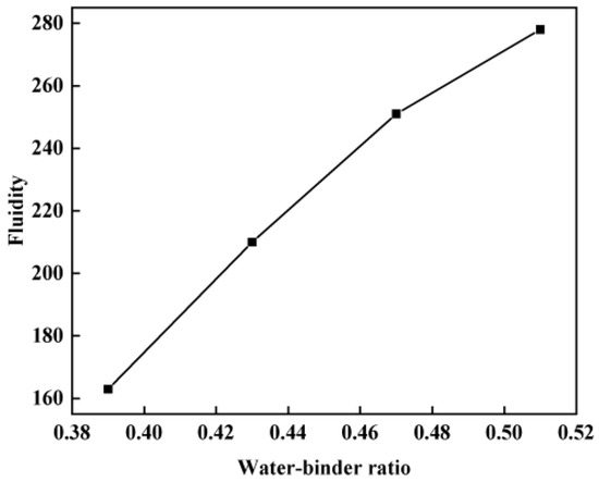 The flowability of the SSAS at different W/B ratios is shown in Figure 4. It was found that at a water–binder ratio of 0.39, the flowability is only about 163 mm, which can further decrease during casting due to rapid setting, adversely affecting the molding of specimens. This also impacts the uniformity of the specimens, resulting in a surface and internal structure that is porous and unevenly distributed. The flowability of the mortar increases with the W/B ratio; so, subsequent experiments were conducted, using a 0.43 W/B ratio, 0.47 W/B ratio, and 0.51 W/B ratio as variables. At a W/B ratio of 0.43, the flowability reached about 210 mm, and the mortar exhibited good workability throughout the casting process, resulting in smoothly molded specimens. When the W/B ratio was further increased to 0.51, although the flowability was higher, exceeding 270 mm, there were no issues with segregation or bleeding, and the specimens were normally formed.