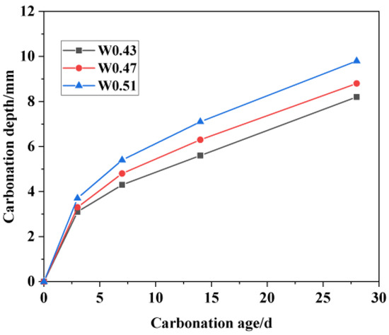 Figure 7 displays the coloration images of SSAS specimens at various W/B ratios at 3, 7, 14, and 28 days of carbonation. The depth of carbonation can be determined based on the color presented by the samples. The figure clearly illustrates that as the W/B ratio rises, the depth of carbonation in mortar specimens also increases across various carbonation ages, with the rate of increase becoming more pronounced at higher ratios. This trend indicates a corresponding decrease in the carbonation resistance of the SSAS. Specifically, after 28 days of carbonation, the carbonation depth in the W0.47 group increased by 7.31% compared to the W0.43 group, and in the W0.51 group, it increased by 20.73%.