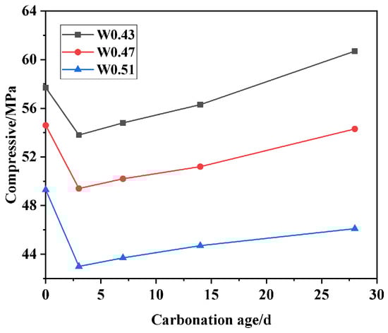 The compressive strength of SSAS concrete after carbonation is shown in Figure 8 at varying W/B ratio and carbonation ages. After 3 days of carbonation, the compressive strength of the sample exhibited a decline compared to the pre-carbonation sample, influenced by different W/B ratios. This decline is attributed to several factors. First, size discrepancies between standard cured specimens and carbonation test specimens create a size effect [51]. Additionally, carbonation lowers the Ca2+ concentration in pore solution, leading to the decalcification of the hydration product C-S-H [52]. This reaction not only decreases the pH, potentially weakening the structural integrity of the C-S-H gel [53]—the primary strength contributor of cement—but also transforms it into less robust gels like silica gel and alumina gel, with a lower Ca/Si ratio. Consequently, this softens the paste, diminishes the bonding strength, and reduces the compressive strength [54]. Early carbonation stages also release bound-free water from CH, causing drying and surface shrinkage cracks, which are more pronounced in samples with higher water–binder ratios [55,56]. Specifically, within the initial 0–3 days, compressive strength decreased by 6.8%, 9.5%, and 12.8% in the W0.43, W0.47, and W0.51 groups, respectively.