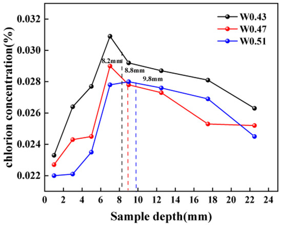 Figure 9 depicts the chloride ion concentration profile in SSAS concrete across various water-to-binder ratios. The figure shows that Cl− concentration is initially lowest at the specimen surface, increases to a peak, and then diminishes deeper within the specimen. Despite the expectation of a uniform chloride ion distribution due to the thorough mixing of sea sand during the sample preparation, carbonation significantly alters this distribution. After carbonation, chloride ions congregate around the carbonation front—marked by a phenolphthalein color change—at the boundary between carbonated areas and uncarbonated areas [59,60]. This clustering arises because carbonation liberates some bound Cl−, generating the free Cl− in the carbonated zone and establishing a concentration gradient [37]. This gradient drives the diffusion of Cl− from the carbonation front towards the non-carbonated interior, leading to a localized Cl− peak at this interface. The peak concentration of chloride ions near the carbonation front indicates a higher risk of steel reinforcement corrosion after carbonation. This finding suggests that although SSAS concrete can initially bind chloride ions effectively, carbonation can release these ions, creating localized concentrations that accelerate corrosion. Therefore, for SSAS concrete structures exposed to marine environments, additional protective measures may be necessary to ensure long-term durability [61].