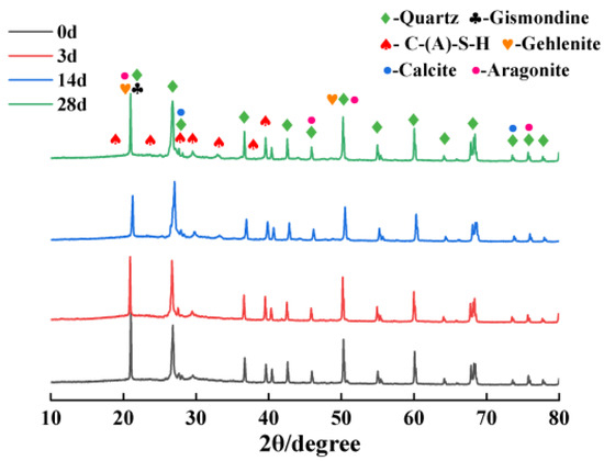 Figure 10 presents the XRD spectra of SSAS specimens with a varying W/B ratio after 28 days of standard curing. The spectra reveal that although the hydration product types remain consistent across different ratios, the intensity of their peaks varies. The primary hydration product, C-(A)-S-H gel, is evident through a broad, diffuse peak between 15° and 40° [62]. Notably, as the W/B ratio increases, the diffraction peak height of C-(A)-S-H gel diminishes, suggesting a declination in its formation. This reduction correlates with a gradual deterioration in the mechanical property of mortar, as the hydration products that typically enhance the internal pore structure and provide strength are less prevalent in higher water-to-binder ratio samples. Additionally, Gismondine (CaAl2Si4O12·H2O) forms a diffraction peak around 21°, which also shows a decline in intensity with increasing water-to-binder ratios. The presence of quartz peaks originates from the sea or river sand used in the mortar, while calcite and aragonite peaks, stemming from seashell components in the sand, also feature in the spectra.