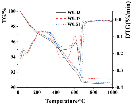 Figure 12 illustrates the SSAS XRD at different W/B ratios across various carbonation ages. The spectra highlight that CaCO3 is present, primarily in the form of calcite at diffraction angles of 28°. This peak is not evident in the samples before carbonation but begins to appear after 3 days of carbonation curing. Because this peak overlaps with the broad peak of C-A-S-H gel, it is difficult to determine the exact height of the peak. The specific amount of CaCO3 formed will be further analyzed in the TG analysis below. The formation of calcite not only fills the internal pores of the mortar but also significantly contributes to its structural strength, thus enhancing the compressive strength of samples as carbonation progresses. This beneficial relationship between carbonation age and mechanical property is primarily due to the effective pore-filling and strengthening properties of calcite.