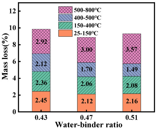 This is because an increase in the water–binder ratio lowers the initial concentration of silicate ions and alkalinity, reducing the quantity of hydration products formed, leading to an increase in porosity and a consequent decrease in the strength of the mortar [22].