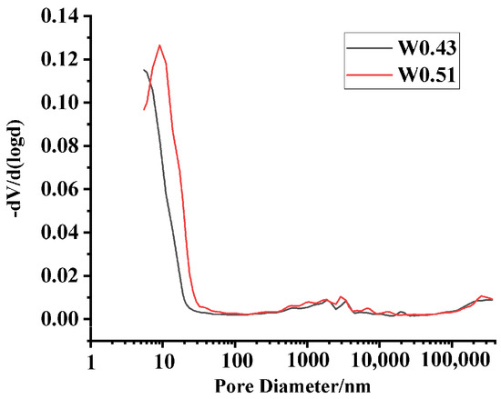 After the selected samples have undergone hydration cessation and drying, their pore structures are analyzed using an AutoPore 9500 pressure porosimeter (Produced by MicroActive, Norcross, GA, USA). The porosimeter operates within a testing pressure range from 0.10 to 61,000.00 psia, which allows for a detailed examination of the samples’ microstructural features. The mercury intrusion test conducted provides critical data on porosity and the distribution of pore sizes, offering insights into the material’s permeability and structural integrity.