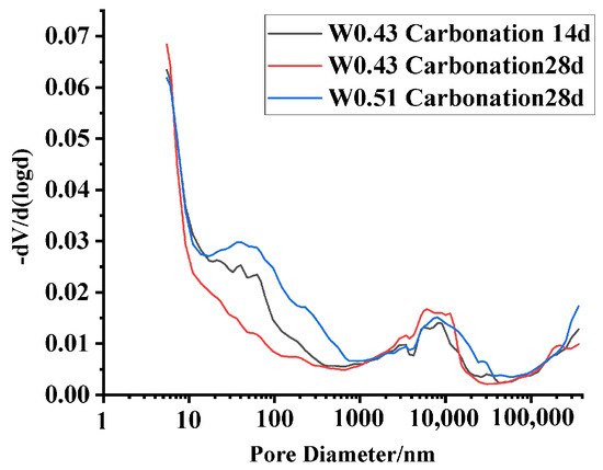 Following carbonation, the pore size distribution in the concrete broadens, and new peaks around 10,000 nm become apparent on the differential curve, signaling a worsening trend in pore sizes. The porosity in these groups shifts from predominantly harmless to a greater proportion of harmful pores. This transformation indicates substantial structural changes within the mortar, leading to a potential decrease in mechanical strength and durability due to heightened susceptibility to environmental penetrants such as CO2 and chlorides. After the carbonation process, the increase in the proportion of harmful and very harmful pores in the samples can lead to the enhanced diffusivity of the concrete. The presence of large and medium pores provides faster diffusion paths, enabling harmful substances to move more rapidly within the material. This accelerates the deterioration process of the concrete and shortens its service life.