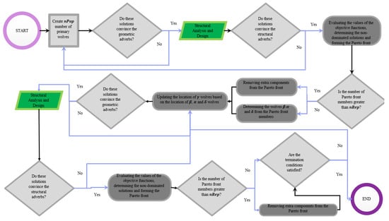 In the present study, the iterations of the algorithm have been performed with the branch connection with the SAP2000 numerical model, and this iteration has been conducted until the structural constraints are accepted [18,19]. The flowchart of the algorithm iteration is shown in Figure 4. Generally speaking, in all CSI (Computers and Structures, Inc.) software, there is a path for importing data from a programming language, and there is exactly such a process in SAP2000 software, and it has been used in the present research, so-called OAPI, which stands for Open Access Programming Interface. In this method, first the model is modeled in SAP2000, and then the algorithm uses SAP2000 designs to change its variables at each stage.