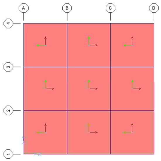 Moreover, the 3D view and the studied structural plan are shown in Figure 5 and Figure 6. In Figure 6, the numbers and letters represent the axes of the beams of the structure in the X and Y directions, respectively.