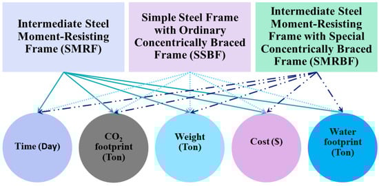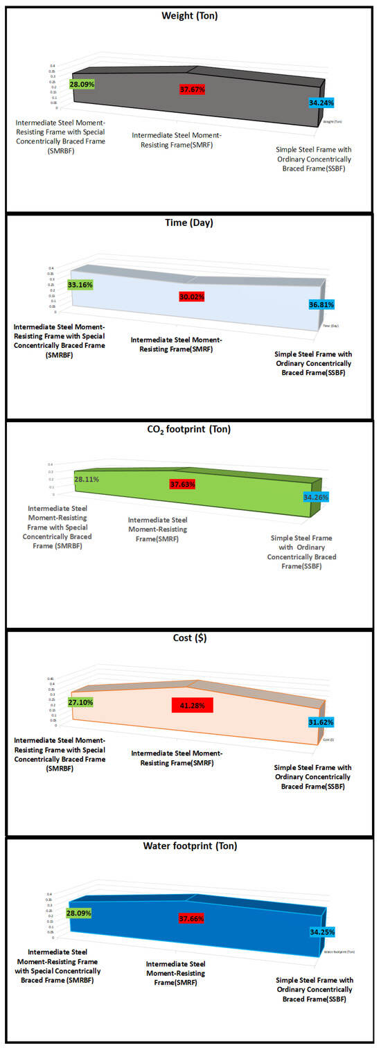 In the Pareto front of Figure 24, the vertical axis (Z) and the horizontal axes (X) and (Y) indicate virtual carbon, construction time, and virtual water, respectively. As can be seen, the shortest construction time and the highest amount of water consumed during the material production process are specific to the intermediate steel moment-resisting frame. The lowest amount of carbon dioxide emitted and the most water consumed in the material production process are also specific to the intermediate steel moment-resisting frame with a specially concentrically braced frame.