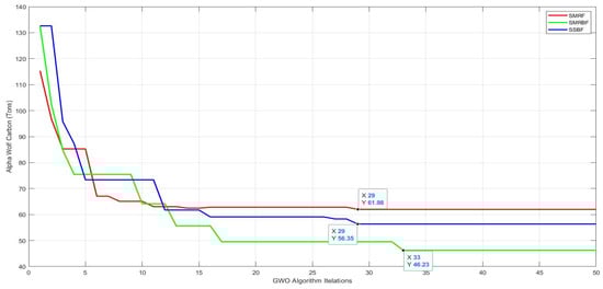 As depicted in Figure 16, as the algorithmic process advances and the volume of consumed materials decreases, there is a corresponding reduction in carbon dioxide emissions. Ultimately, for the intermediate steel moment-resisting frame, the intermediate steel moment-resisting frame with a special concentrically braced frame, and the simple steel frame with an ordinary concentrically braced frame, the respective amounts of carbon dioxide released reach 61.89 tons, 56.35 tons, and 46.23 tons. The quantity of carbon dioxide emitted during the material production process in the intermediate steel moment-resisting frame with a specially concentrically braced frame is notably lower than in the other studied frames. Therefore, its selection as a green structure aligns with the definitions provided in the introduction of this research and appears to be a judicious choice.