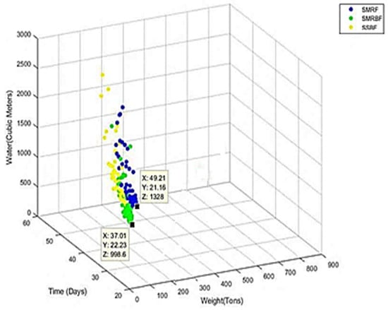 With multiple objective functions, the concept of optimality shifts in multi-objective problems. Instead of seeking a single solution, as in single-objective optimization, the aim becomes to identify suitable compromises. A crucial aspect of multi-objective optimization involves generating a front of non-dominant solutions, known as the Pareto front. Pareto optimal solutions are those where none dominates the others with respect to the objective functions. In Figure 21, the vertical axis (Z) represents the amount of virtual water, which holds significant environmental importance. The horizontal axes (X) and (Y) denote the construction time and the weight of structural members, respectively. Notably, the intermediate steel moment-resisting frame with the special concentrically braced frame (depicted in green) exhibits the lowest weight and water consumption during material production. Meanwhile, the intermediate steel moment-resisting frame (depicted in blue) is characterized by the minimum construction time.