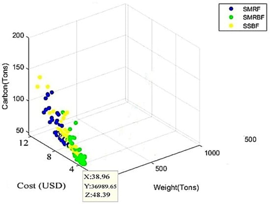 In Figure 22, carbon, cost, and weight functions are selected to draw the Pareto front. The vertical axis shows the amount of carbon dioxide emitted. In terms of reducing carbon production, the effect of an intermediate steel moment-resisting frame with a specially concentrically braced frame is quite evident. On the other hand, one of the horizontal axes (x) indicates the weight of structural members. Considering the importance of weight loss in terms of seismicity, weight loss is definitely evaluated as a positive component. The other horizontal axis (Y) represents the cost of construction, and the intermediate steel moment-resisting frame with a special concentrically braced frame (in green color) has the lowest cost of construction.