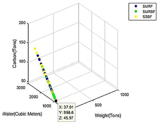 The Pareto front on the objective functions of carbon, water, and weight is shown in Figure 23. The reason for the linearity is the dependence of all three objective functions on one variable, namely the volume of steel. The thing that is clear is that the intermediate steel moment-resisting frame with a special concentrically braced frame in green at the end of the Pareto plane has the lowest number of objective functions compared to the other investigated frames. And as mentioned above, the intermediate steel moment-resisting frame with a special concentrically braced frame was introduced as an environmentally friendly structure due to the minimum amount of virtual water and virtual carbon as a green structure.