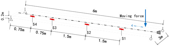 Considering a 1/6 scaled-down model of an average bridge deck [28], a 6 m long simply supported prestressed concrete plate is established, as shown in Figure 3; its dimensions are . The concrete elastic modulus is and the density is . A prestressed tendon is applied in the middle of the plate; its cross-section area is , and the elastic modulus and density are respectively. The PF is set as 200 and 400 kN. A moving force that simulates 1/6 of a heavy vehicle. The speeds are 4 m/s and 10 m/s. The sampling rate is 200 Hz.