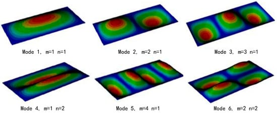 A modal analysis was carried out to evaluate the effect of prestressing on the natural frequency of vibration. The first six vibration modes and corresponding m and n values are shown in Figure 4, and the variation in modal frequencies with the PF is shown in Table 1. It is found that the frequency slightly decreases when applying the PF, while the mode shapes are almost identical.