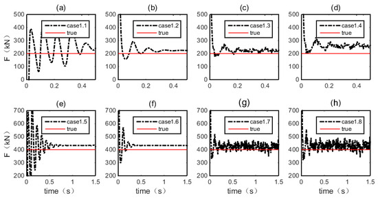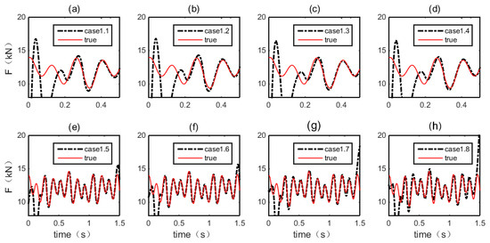 The moving force is determined by the proposed LSF method. Here, case 1.1 is used to demonstrate the application of the LSF. The measuring time T is 1 s, and the main frequency of excitation can be obtained by the Fast Fourier Transform of the responses, which is under 10 Hz. According to Equations (9) and (10), the time step l and time element m are calculated as 10 and 20, respectively, which means that 10 LSFs are applied and that each function has 20 steps. Thus, the dimensions of the LSF influence matrix L are 200 × 10, while the dimensions of the impulse matrix I are 200 × 200, with the amount of inversion decreased over 400 times.