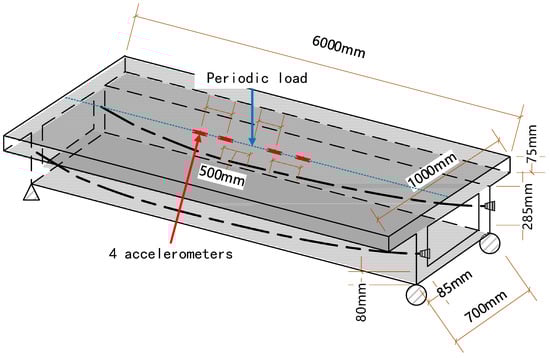 The model is designed according to study [32]; it is a 6 m long box girder with two unbounded prestressed strands, and is a 1/6 scaled-down model of the girders used in the Mass Rapid Transit System Bridge in Chennai, India. The geometry is shown below (Figure 7). The tendon profile is selected as parabolic with eccentricity; the distance of the tendon to the bottom slab along the longitudinal direction is shown in Table 5. Four accelerometers are placed on the top slab as shown, and the sampling rate is 1000 Hz.