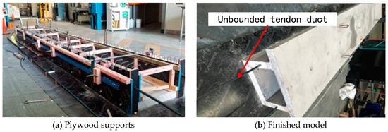 The model is constructed under the guidelines of ACI 318-08 [33], with a supportive framework using plywood being arranged before concreting, as presented in Figure 8a. Sufficient reinforcements are implemented in Figure 8b. Two ducts of the prestressed cables are embedded in the webs, as shown in Figure 8c. The final model is illustrated in Figure 8d. Rebound hammer tests and cylinder compression tests are conducted to estimate the actual strength of the concrete. The elastic modulus of concrete for each specimen is calculated according to AS 3600-2009 [34]. The final results are listed in Table 6. The elastic values of the top slab, web, and bottom slab are 30.6 GPa, 31.38 GPa, and 32.38 Gpa, respectively.